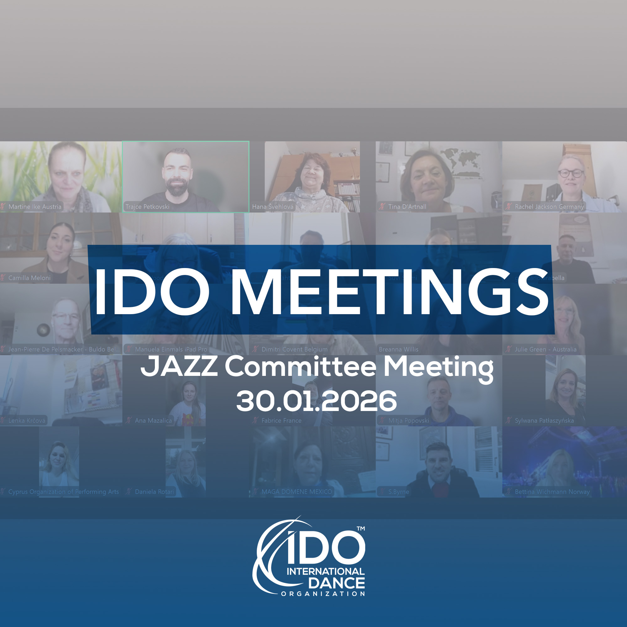 The International Dance Organization (IDO) Jazz Dance Committee held its annual meeting on 30 January 2026, conducted online via Zoom, bringing together 38 delegates and guests from 24 countries.